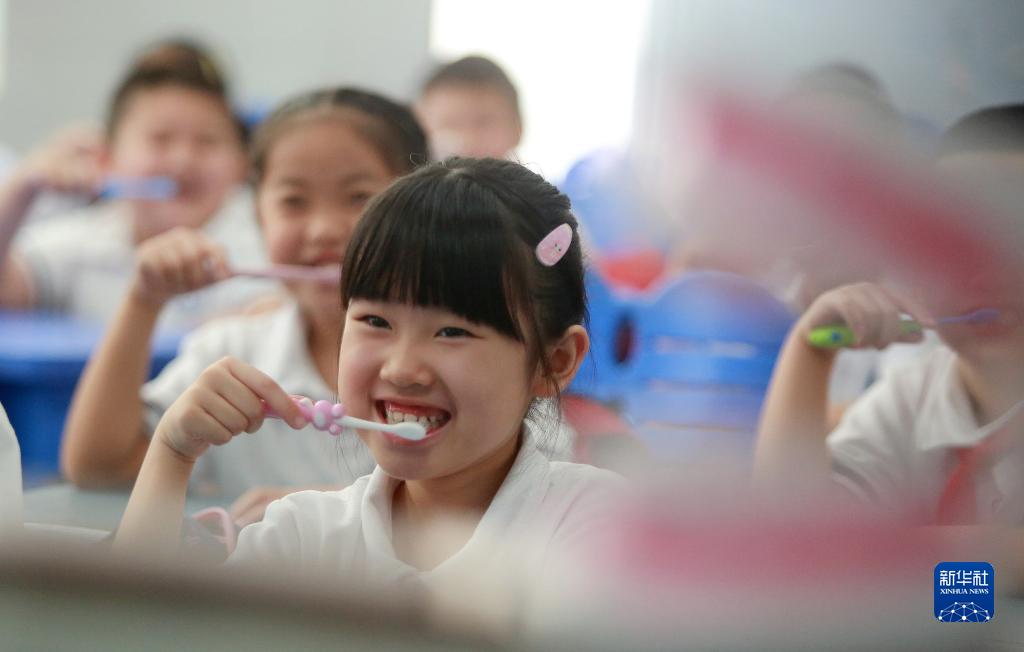 9月19日,在江苏省扬州市朱自清小学,学生在老师指导下练习正确的刷牙方法。新华社