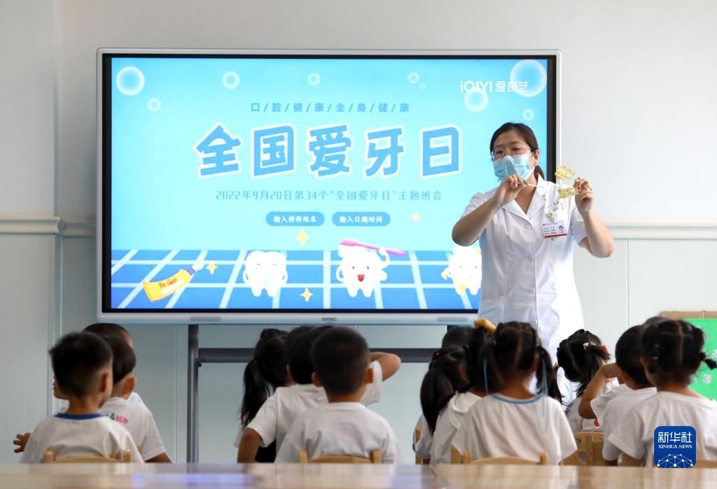 9月19日,在河北省石家庄市井陉矿区横涧乡天护幼儿园,医务人员为孩子们讲解牙齿保健知识和正确的刷牙方式。新华社