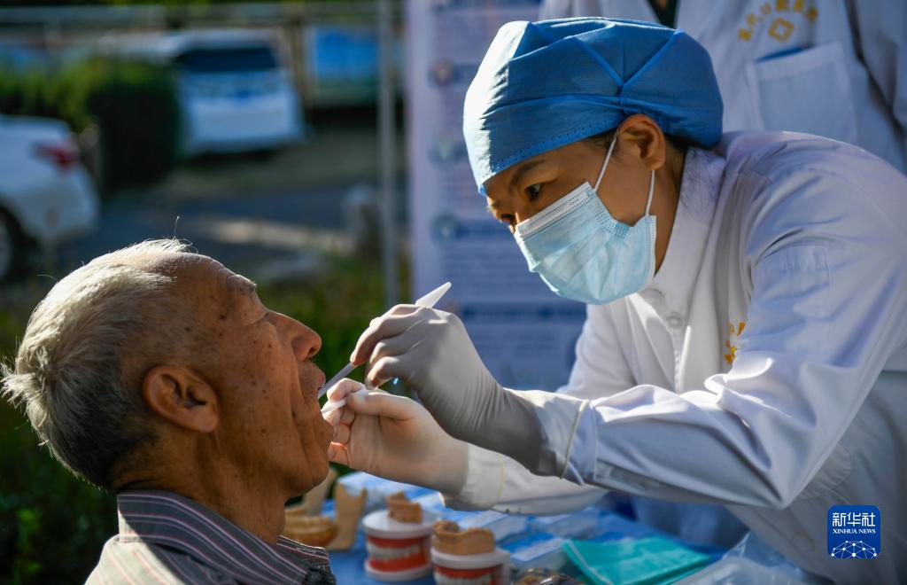 9月19日,医生在河北省遵化市兴旺寨镇何家峪村为村民检查牙齿。新华社