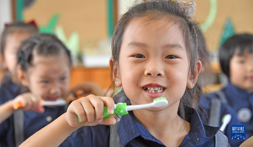 9月19日,浙江省台州市仙居县迎晖幼儿园的小朋友在学习正确的刷牙方法。新华社