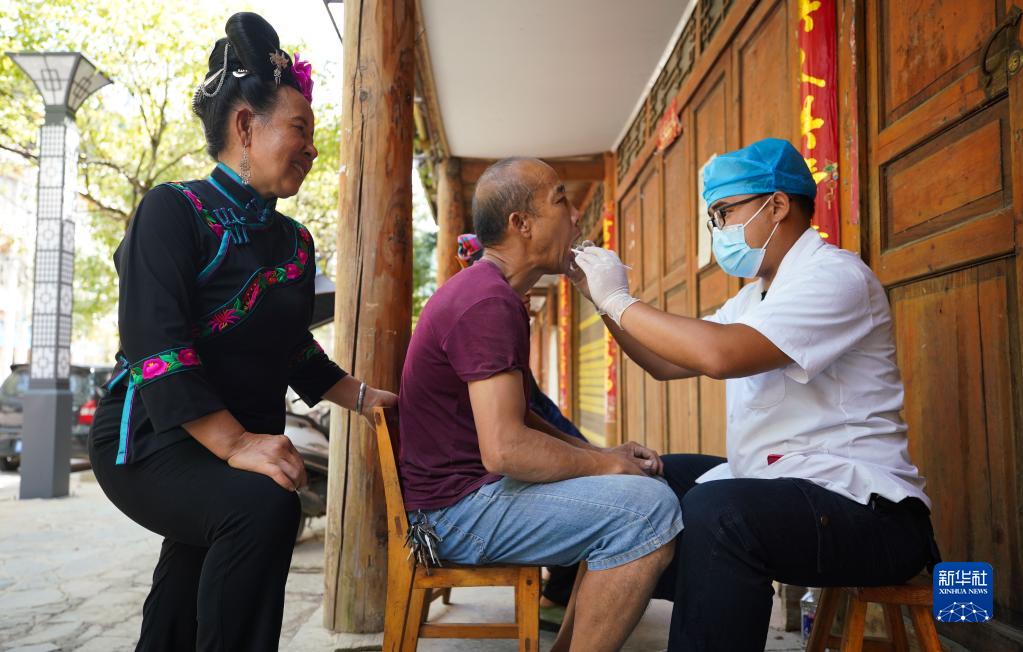 9月19日,村医张震在贵州省黔东南苗族侗族自治州丹寨县排调镇排调村为村民检查牙齿。新华社