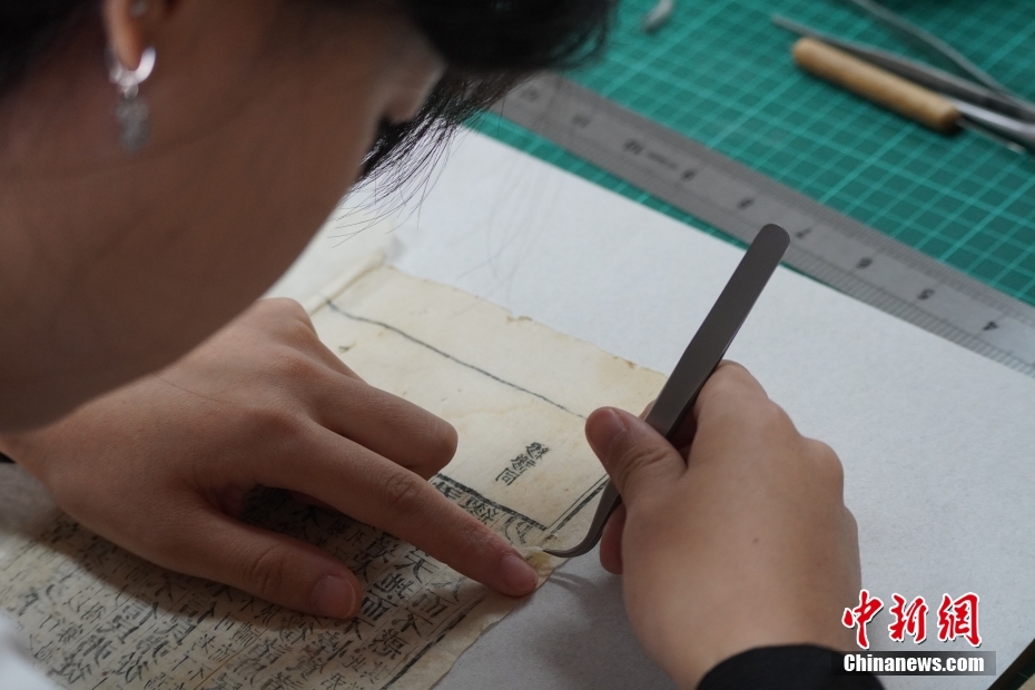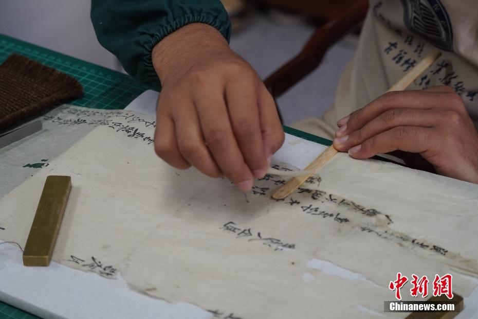 9月22日,兰州资源环境职业技术大学古籍修复技艺传习所内,师生修复老化、虫蛀、破洞、霉变等原因破坏的古籍,通过妙手“医治”让古书“鲜活起来”。