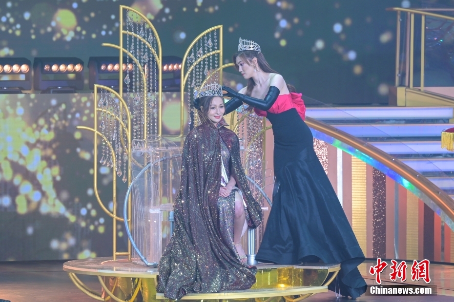 9月25日晚,“2022香港小姐竞选”决赛在香港体育馆举行。19位佳丽经过激烈角逐,林钰洧获得冠军,亚军为许子萱,梁超怡摘得季军。图为赛后由上届港姐冠军宋宛颖(右)为林钰洧戴上后冠。