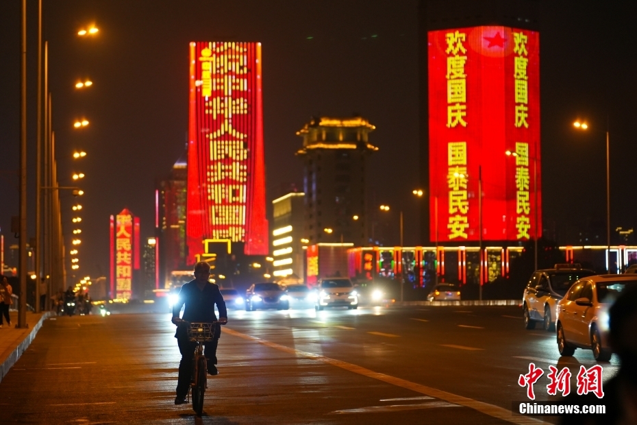 鲜花簇拥、国旗飘扬,中国国庆节前夕各地举办多种方式,营造喜庆祥和的国庆节日气氛,大街小巷、社区公园以及单位厂区门口,到处一片喜庆景象。图为9月29日,山西太原迎泽大街高楼亮灯迎国庆。中新网