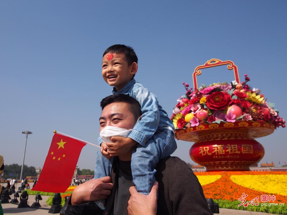 9月25日,北京天安门广场上,游客在"祝福祖国"巨型花果篮前拍照留影。光明网