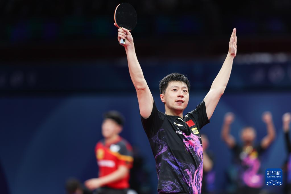 中国队选手马龙在比赛中庆祝胜利,他以3比1战胜德国队选手邱党。新华社