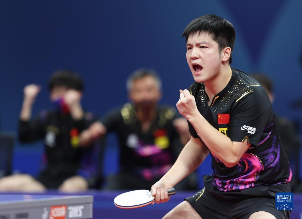 中国队选手樊振东在比赛中庆祝得分,他以3比0战胜德国队选手贝内迪克特·杜达。新华社