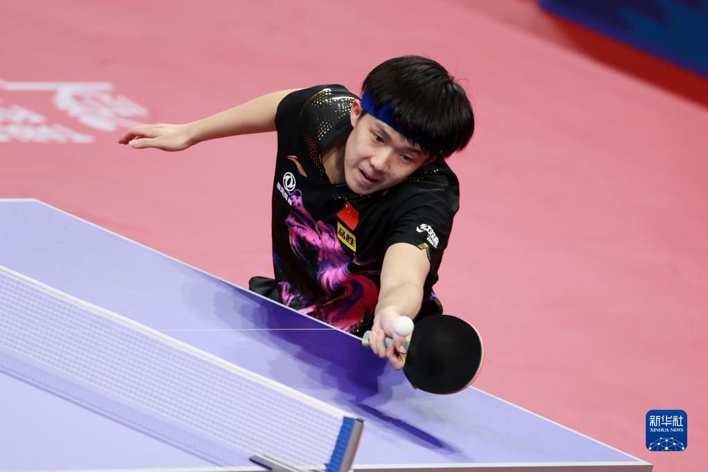 中国队选手王楚钦在比赛中回球,他以3比0战胜德国队选手凯·斯达姆珀。新华社