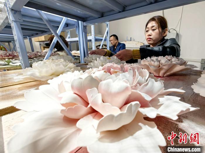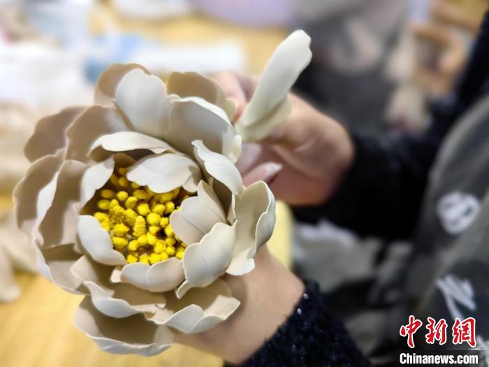用优质白瓷土为原料,纯手工加工成姿态万千的牡丹花,再经过素烧、施釉、上彩等工序,瓷土牡丹花就“诞生”了。图为工人将牡丹瓷花瓣组合成花朵。中新网