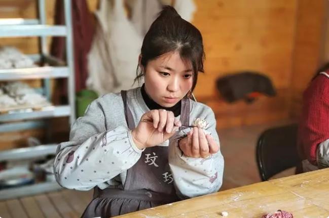 在一家牡丹瓷制作工房里,文璐璐与其他“捻花师傅”坐在桌前,赶制牡丹瓷坯。山东《大众日报》