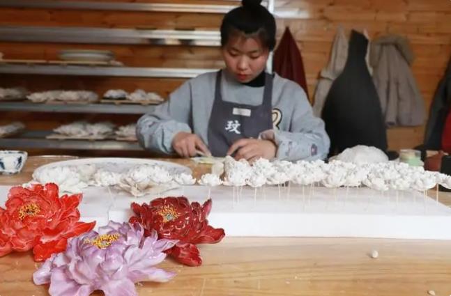 牡丹瓷是山东菏泽牡丹区生产的工艺品之一,经过10余道工序制作,让雍容华贵的牡丹以立体形式“绽放”在瓷盘之上。牡丹文化与陶瓷文化结合,让“中国牡丹之都”的金字招牌愈加亮丽。