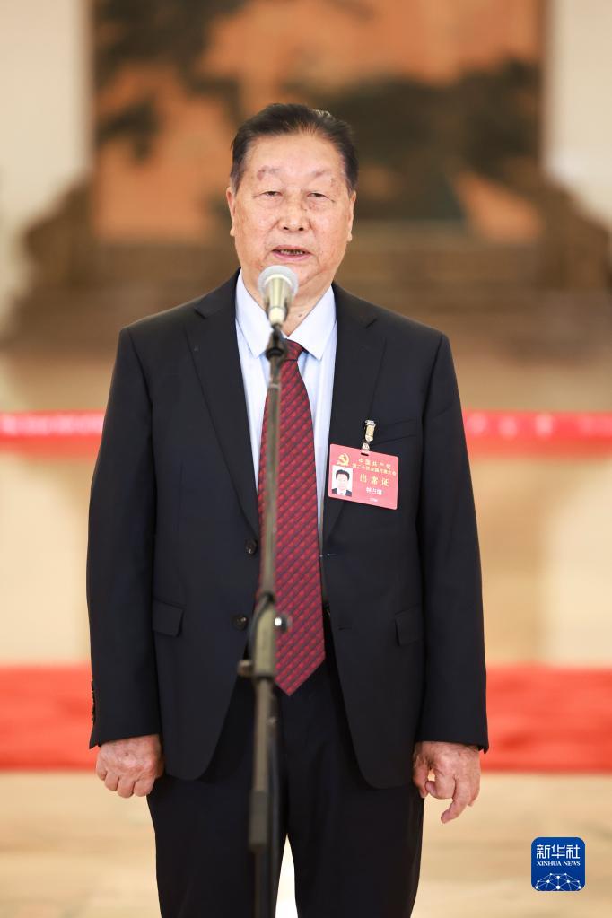 杨宁代表接受采访。新华社
