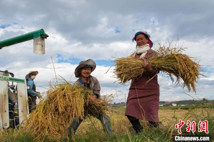 10月16日是世界粮食日。此时中国正值金秋,多地又迎一年谷黄时。走进田间地头,随处可见一片丰收图景,跟随镜头一起来感受孕育希望的田野吧 。 近年来,海拔2300米至2400米的四川盐源县不断加大农业水利设施建设力度,实施高标准农田建设工程,强化农业科技支撑。以农业发展机械化、产业生产规模化、节本增效最大化的发展思路,以粮食增产、农业增效、农民增收为目标,推动全县高原特色农业产业不断发展。图为当地民众正在田间劳作。中新网