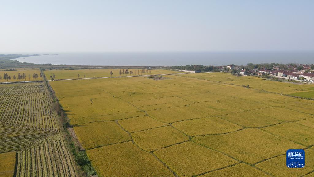 10月16日在安徽省巢湖市槐林镇巢湖岸边拍摄的水稻田(无人机照片)。新华社