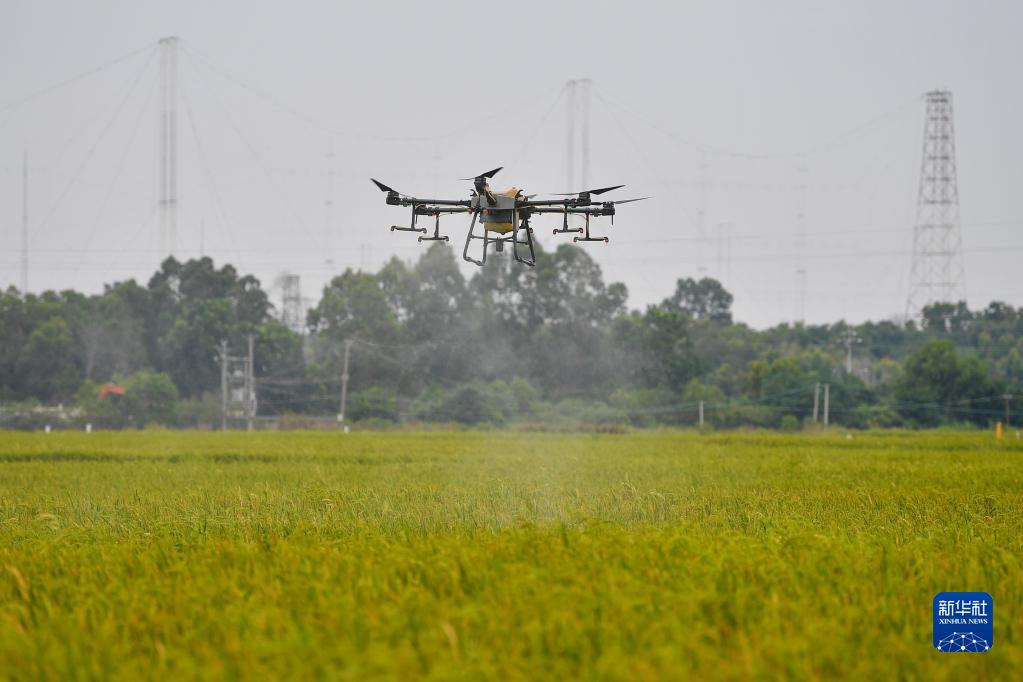 10月15日,无人机在位于海南省东方市的海南湘谷源农业有限公司制种基地喷洒农药。新华社