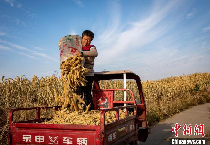 近日,山西省柳林县陈家湾镇西垣村谷子种植基地迎来丰收季。2022年,西垣村全村共种植谷子500余亩,产值达80余万元。由于科学种植、选用优良品种,谷子长势好于去年,预测亩产量可达600斤左右,为了抢在最佳收获期适时收获,村民采用人工割谷穗的传统方式收割,在保证收获进度的同时,确保不丢穗不落穗,颗粒归仓。图为村民收割谷子、装车的忙碌景象。中新网