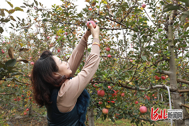 近日,河北易县牛岗乡台底村,该县“2022我在牛岗有棵苹果树”暨电商助力乡村振兴采摘节正式拉开帷幕。活动当天,台底村的28万公斤苹果销售一空,销售额达到813.8万元。图为游客在易县台底村苹果园采摘苹果。河北日报