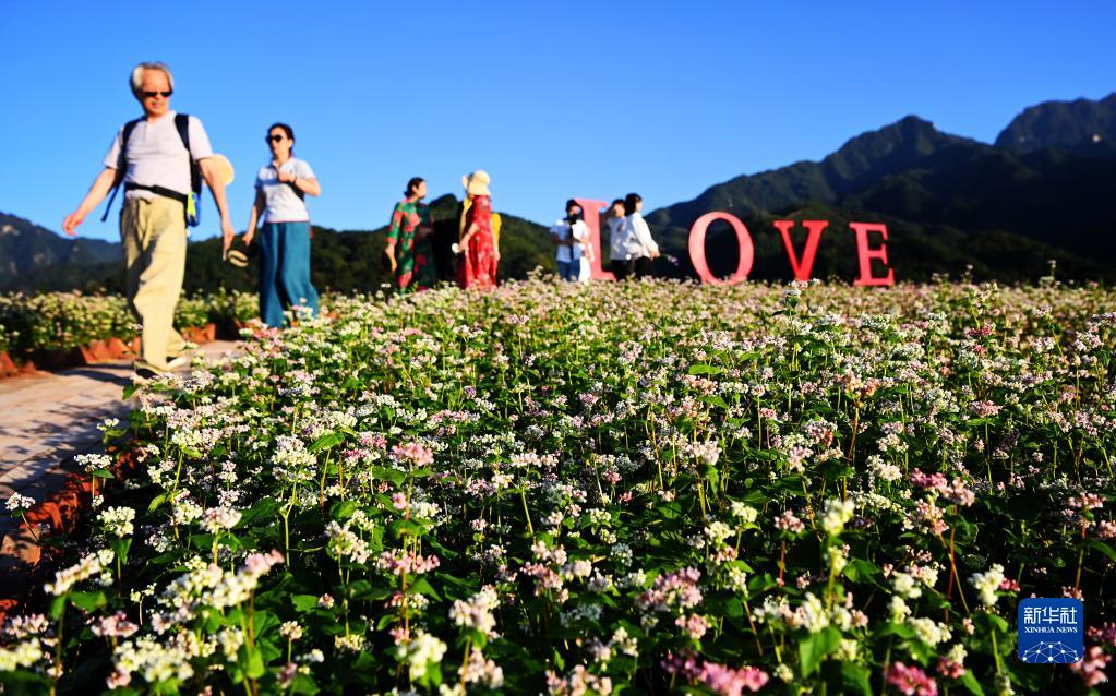 游人在西安市蓝田县九间房镇峪口村荞麦花海农业景区游览(9月28日摄)。新华社
