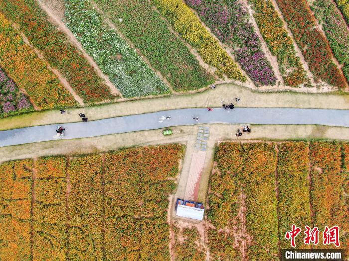 10月26日,位于江西南昌新建区的马兰圩湿地公园各色鲜花竞相绽放,从空中俯瞰,花海五彩斑斓,分外美丽。不少市民来此踏秋游玩,享受欢乐时光。图为航拍江西南昌新建区的马兰圩湿地公园各色鲜花竞相绽放分外美丽,不少游客在公园中踏秋游玩。中新网