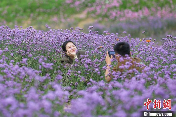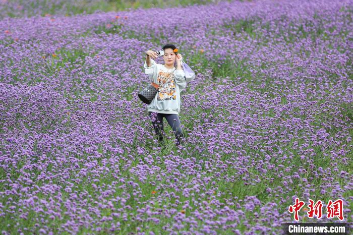 10月26日,位于江西南昌新建区的马兰圩湿地公园各色鲜花竞相绽放。图为市民在花海中拍照“打卡”。中新网