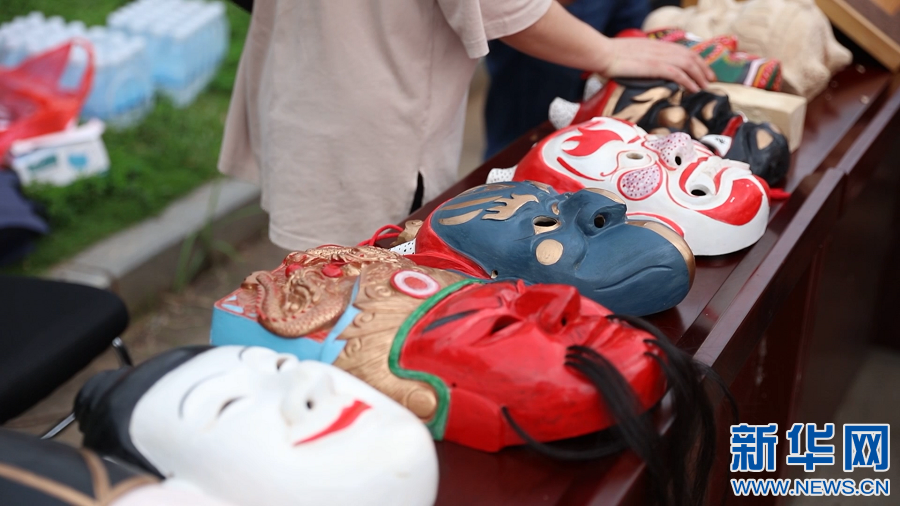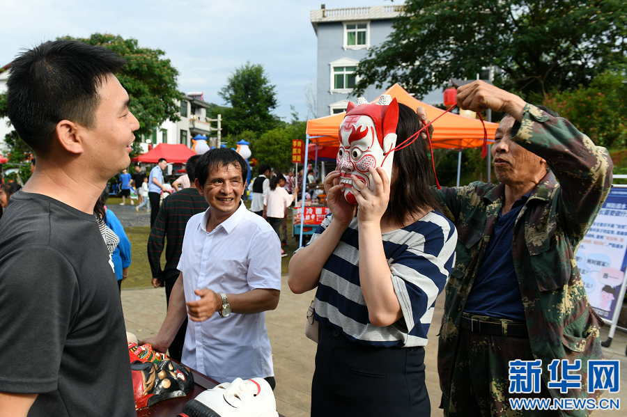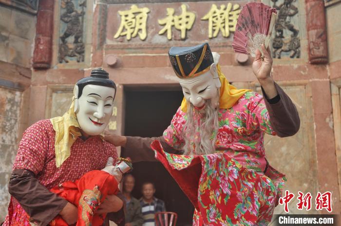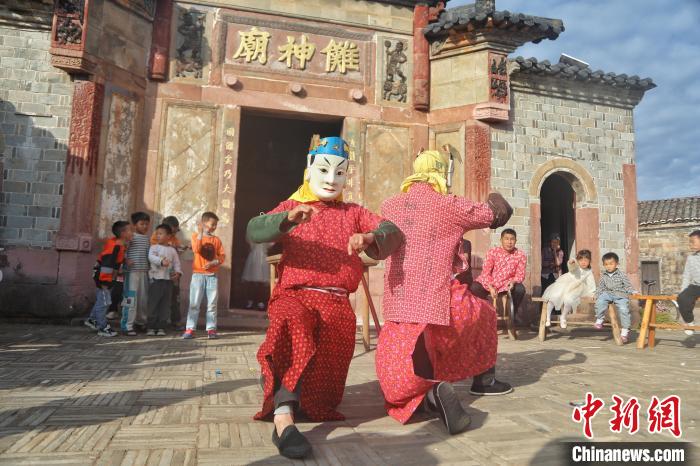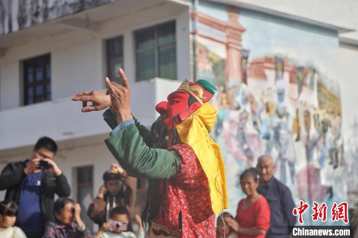 身着傩服的演员正在表演,吸引游客和村民观看。中新网