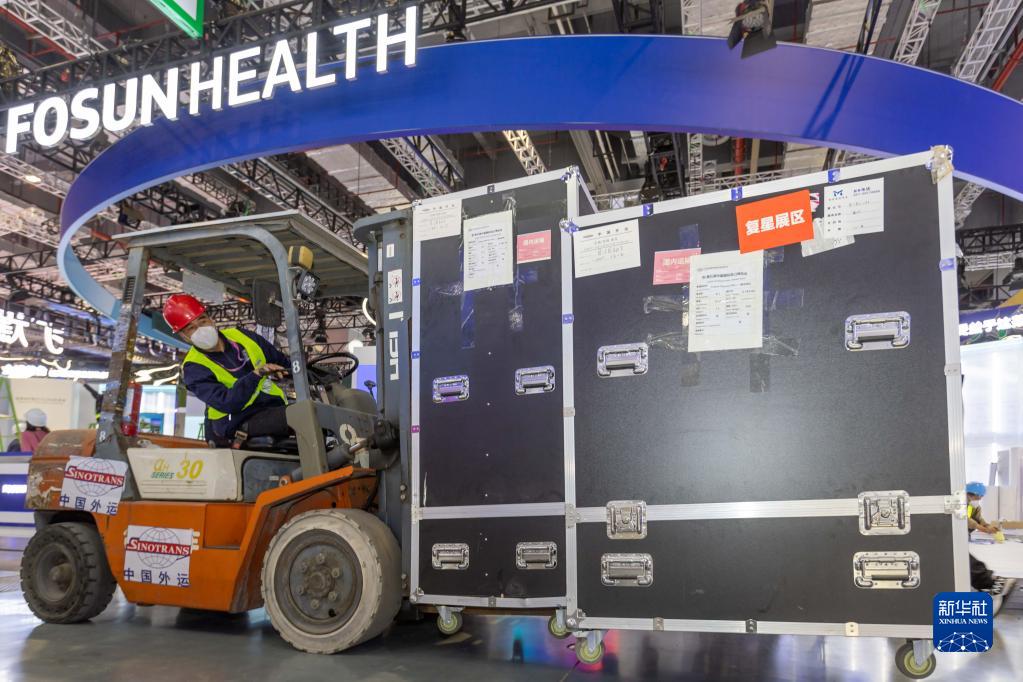 10月31日,工作人员驾驶叉车运送展品。新华社