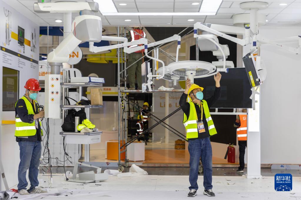 10月31日,工作人员在展位上安装设备。新华社