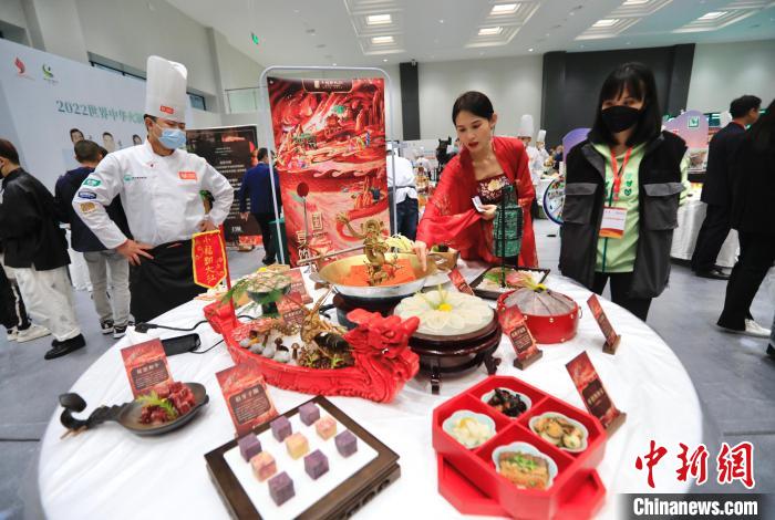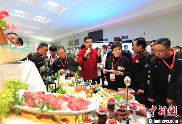 中华火锅宴大赛中,来自四川、重庆、北京、山东等省市的34支团队尽显厨艺。本次大赛以“火锅宴席”为竞赛模式,集产品、创意、服务于一身,综合考评火锅企业的服务水平。图为参观者观看摆放好的火锅。中新网