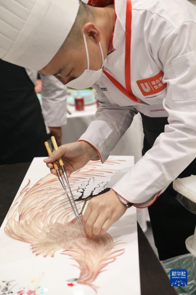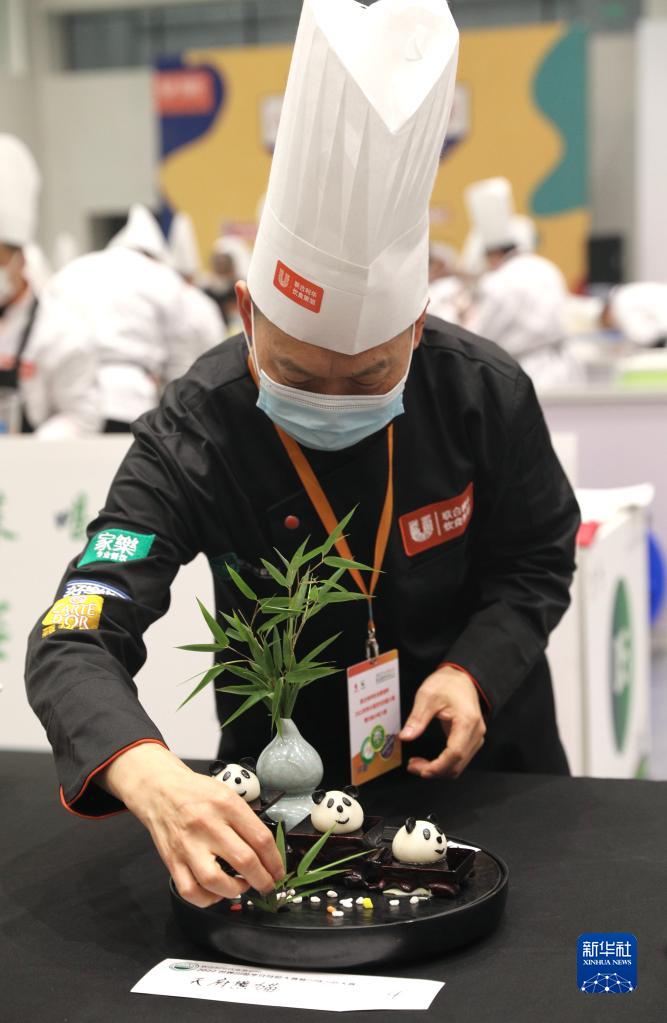 11月3日,厨师在世界川菜烹饪技能大赛暨川味小吃大赛上进行装盘。新华社