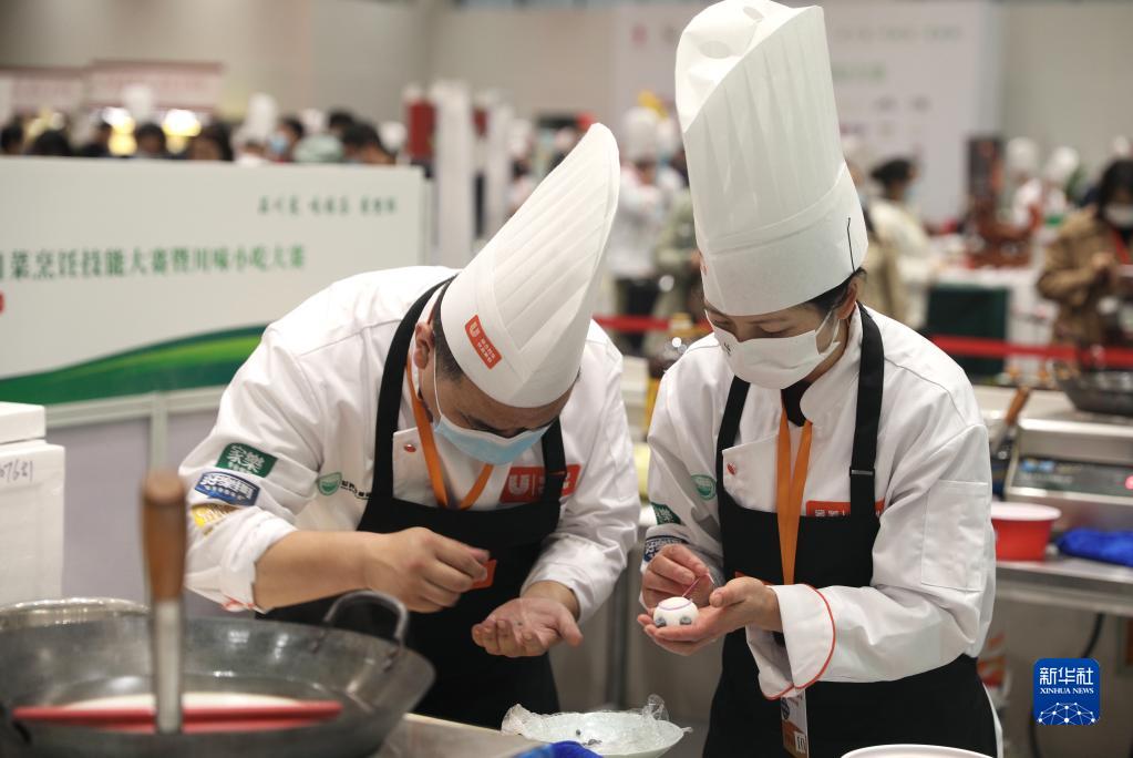 11月3日,厨师在世界川菜烹饪技能大赛暨川味小吃大赛上制作特色小吃。新华社