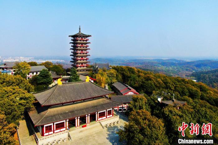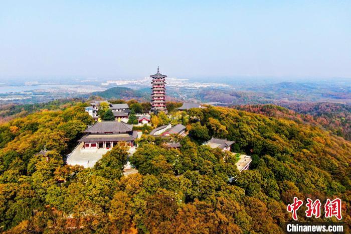 11月8日,航拍位于安徽省肥西县的中国国家AAAA级旅游景区、国家级森林公园——紫蓬山风景区,西庐古刹、连绵群山相互映衬,层林尽染,色彩斑斓,美景如画。图为紫蓬山风景区西庐古刹。中新网