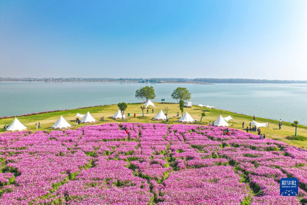 近日,安徽省合肥市肥东县梁园镇护城社区大片格桑花渐次绽放,成为扮美乡村的一道靓丽风景,吸引游客赏花游玩。图为11月7日,游客在安徽省合肥市肥东县梁园镇护城社区格桑花海内游玩(无人机照片)。新华社