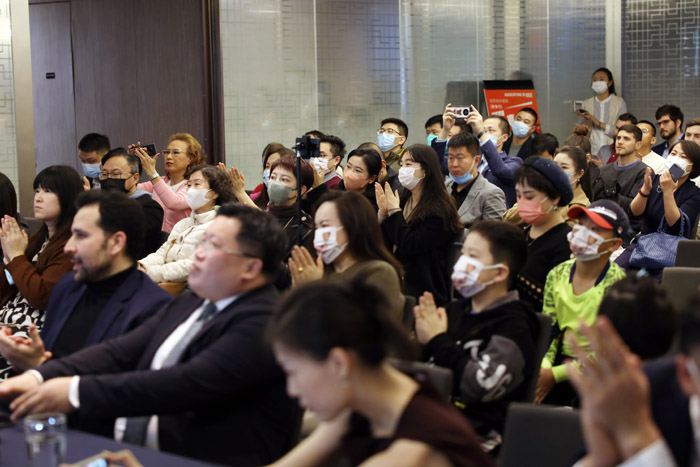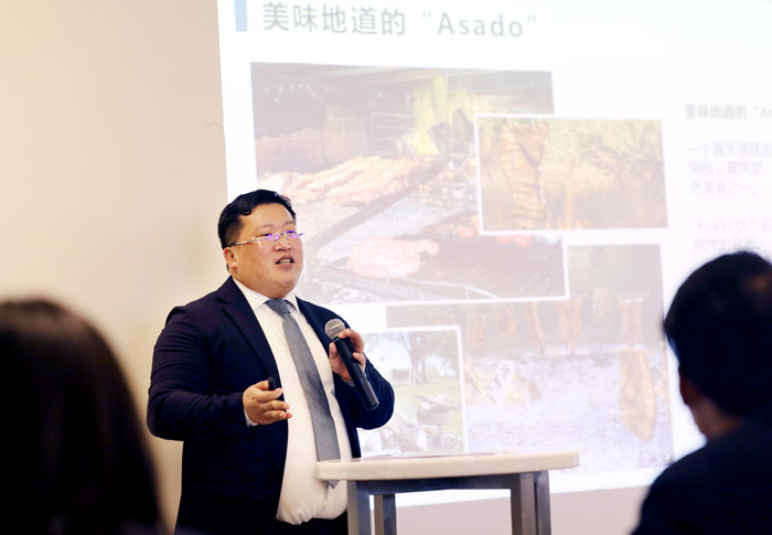 11月13日,Digiant电子商务有限公司创始人朴正日在活动现场向观众介绍阿根廷牛肉。南美侨报网特约记者卞程宣摄