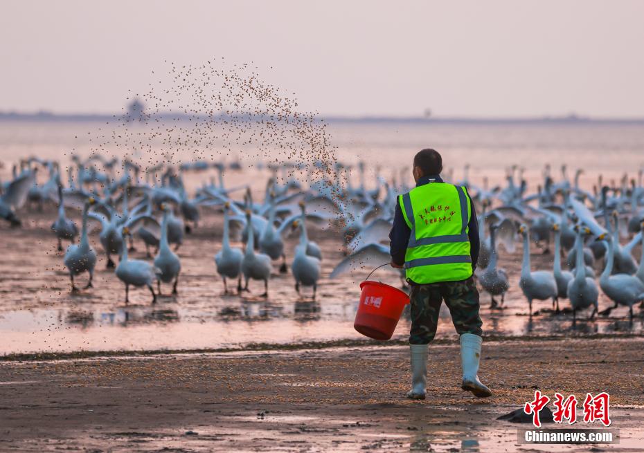 荣成大天鹅国家级自然保护区的工作人员在大天鹅自行觅食的基础上,每天定时投喂。 中新网