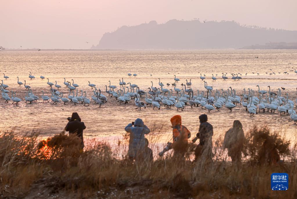 11月13日,在荣成市成山镇天鹅湖湿地,摄影爱好者在拍摄大天鹅。新华社