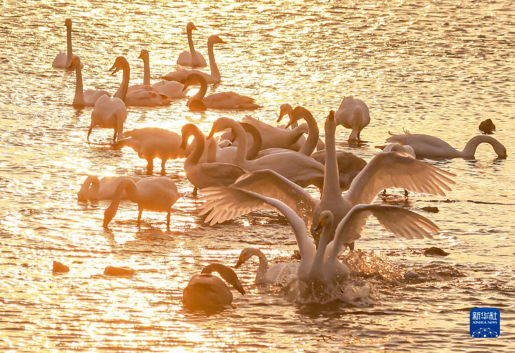 近日,大批大天鹅飞抵山东省荣成市成山镇天鹅湖湿地栖息越冬,场面蔚为壮观,吸引众多游客前来欣赏。