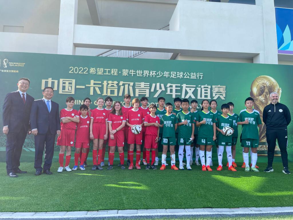 世界杯期间,中国蹴鞠通过多种形式亮相卡塔尔。11月21日,中国—卡塔尔青少年友谊赛、中卡青少年蹴鞠交流体验活动在卡塔尔多哈足球训练中心共同举行。本次活动由中国驻卡塔尔大使馆、文化和旅游部中外文化交流中心、山东省文化和旅游厅、淄博市人民政府共同主办,蒙牛集团等单位提供支持。在卡塔尔世界杯全球官方赞助商蒙牛集团支持下,“探访足球起源文化之旅”还将走进国际足联官方球迷节现场,举行蹴鞠文化展示推广活动,向全世界球迷展示蹴鞠文化魅力。图为中卡青少年球员进行友谊赛。 中新网