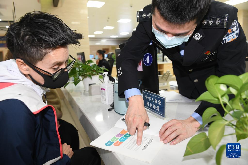 浙江省绍兴市新昌县是一个经济活跃的小县城,拥有涉外企业近百家。为服务好外籍高层次人才,当地公安局出入境管理大队建立涉外企业服务直通车和外籍人才服务警官制,为企业和外籍人员提供个性化定制服务,营造良好的涉外营商环境。图为11月22日,在新昌县公安局出入境管理大队办事窗口,工作人员向一名智利籍足球教练(左一)介绍居留延期政策。