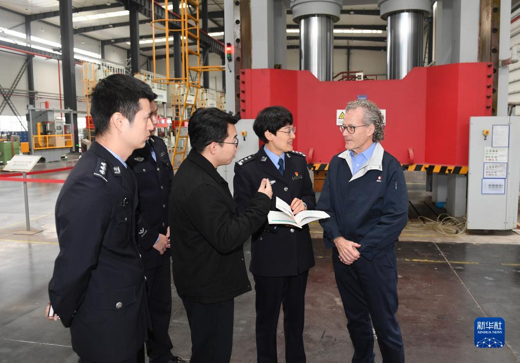 11月22日,在新昌县浙江美力科技股份有限公司,当地出入境管理大队工作人员为一名瑞士籍专家(右一)介绍居留政策。