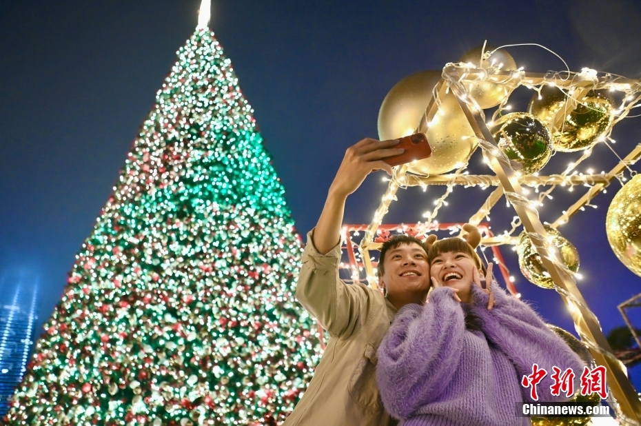 市民与巨型圣诞树合影。