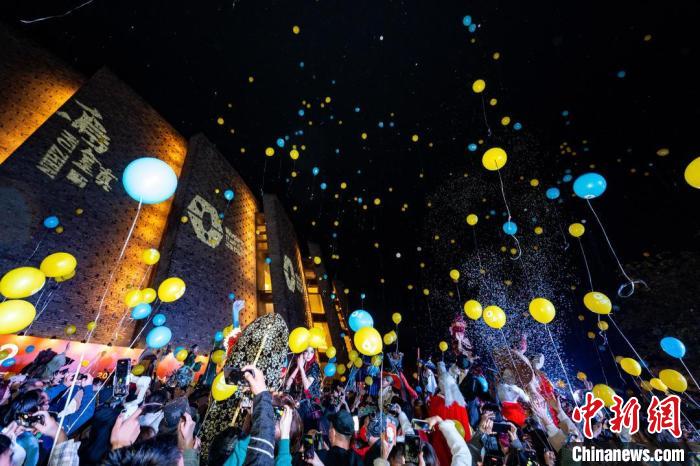 11月25日晚,观众在乌镇大剧院门前放飞气球。中新网