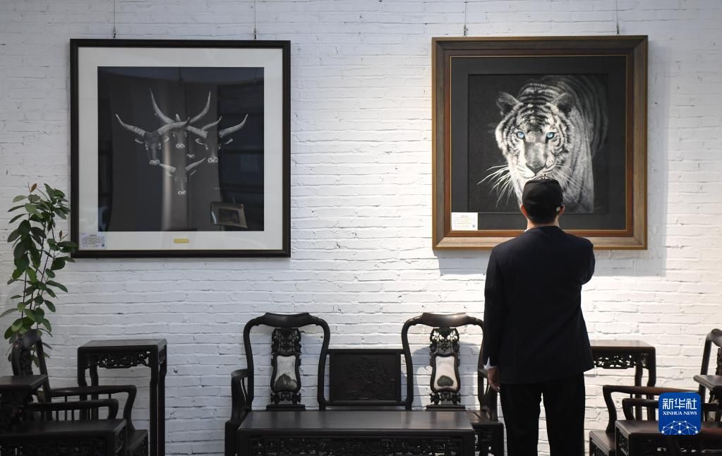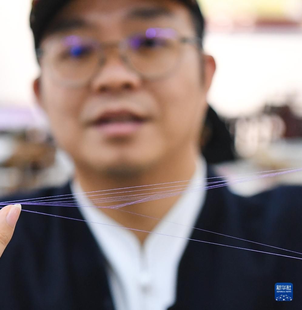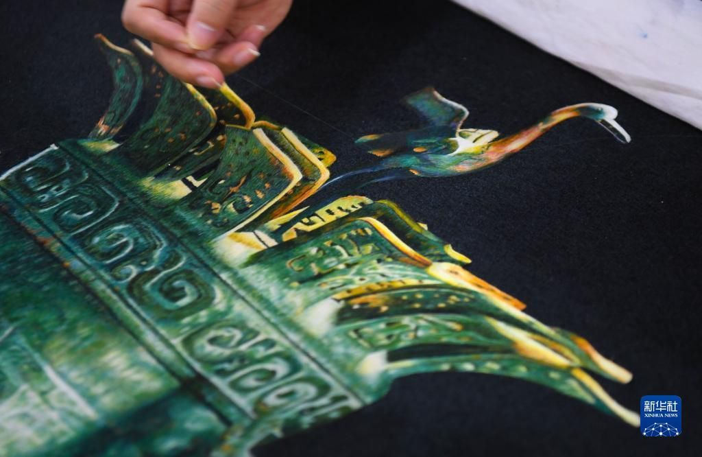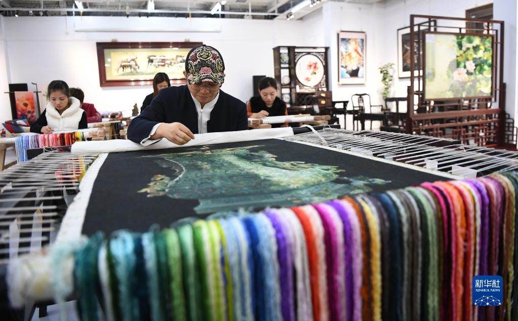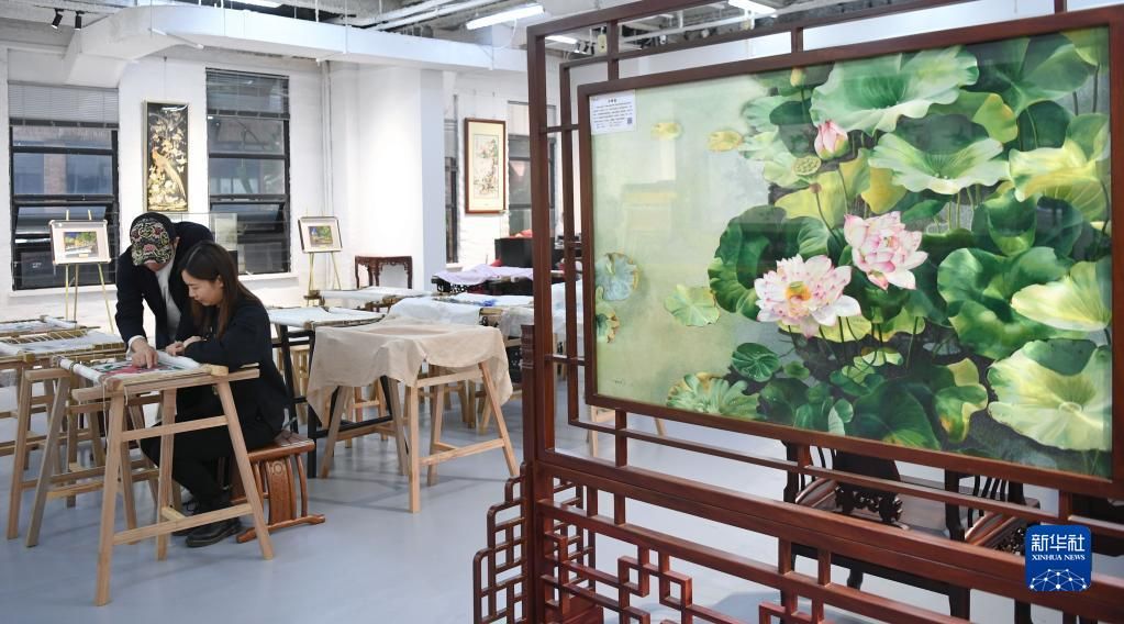 王新元是中国非物质文化遗产广绣项目的广州市级代表性传承人。作为年轻一代的传承人,王新元的广绣作品和技艺既有代代传承的非遗工艺,也有与时俱进的创新发展。他以“传承不守旧、创新不忘本”的思路积极拓展,将油画、摄影、国画等多种艺术形式的线条、结构、色彩、光影变化融入广绣作品,并开拓性地选取名画、青铜器、人物肖像等为主题,大胆创新。图为在广州市荔湾区的工作室,王新元摆放广绣作品(12月6日摄)。