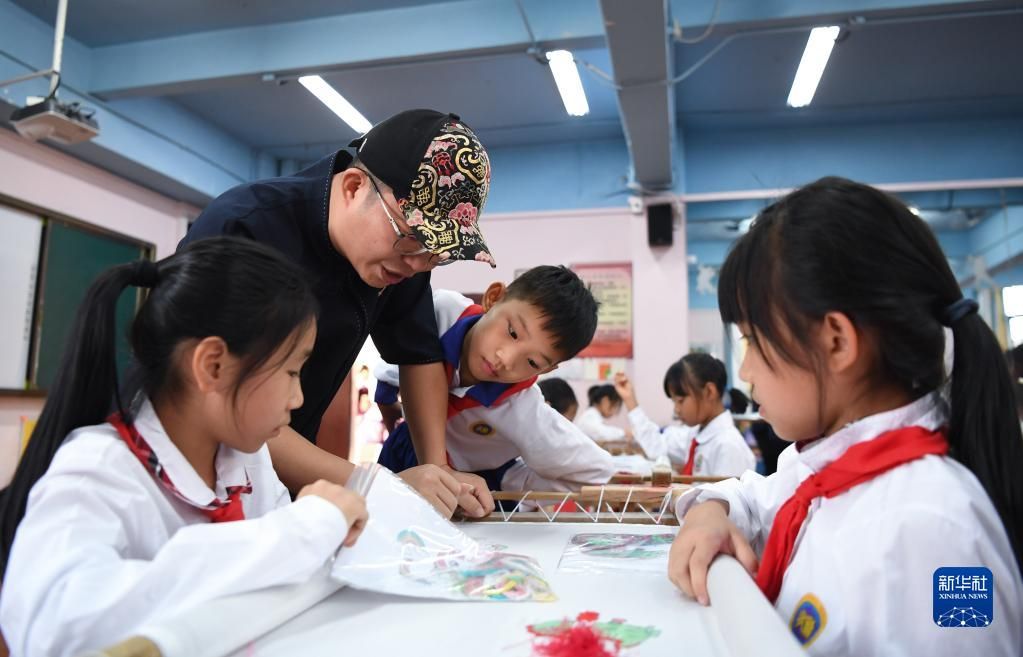 王新元积极参与社会公益活动,大力推动广绣非遗进校园、进社区等活动,让更多的人了解广绣文化,坚定文化自信。图为10月12日,在广州市荔湾区康有为纪念小学的广绣课堂,王新元(左二)在指导学生。