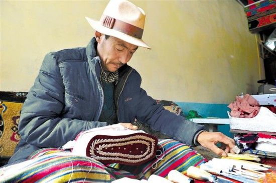 近年来,西藏自治区大力支持传统手工艺产业发展,加强非遗保护,鼓励特色文化产品创新。目前,西藏传统手工艺产业朝着“经营品牌化、管理标准化、产业规模化”方向发展,不断完善产品生产、加工、销售有机结合和相互促进的机制,呈现出蓬勃发展新态势。 图为在白朗县嘎东镇兴旺传统民族服饰农民专业合作社,技工在制作藏靴。《西藏日报》