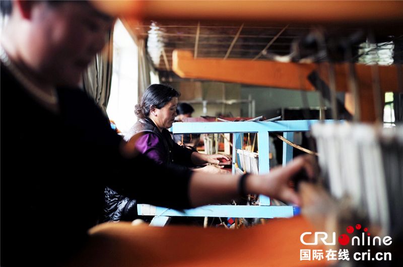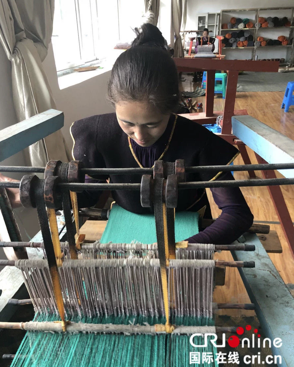 林芝市林芝镇卡斯木村2014年创办氆氇加工坊。氆氇是藏族传统手工织造的羊毛布料,用来缝制藏族人日常的民族服装。25名女村民在村主任桑杰措姆带领下,传承传统制作工艺,经过捻线、染色,织造出具有工布藏族特色的氆氇。目前,用这些氆氇制作的服饰和包已销往内地。员工们农忙时务农,农闲时织氆氇,每人每月增收约3000元。桑杰措姆打算开设产品展示厅,把氆氇制作的工布藏族服饰和织品推介给更多客户和旅游者,在传承传统手工艺的同时,推动村民持续增收。图为织氆氇的妇女国际在线