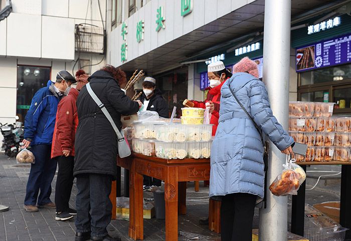 12月9日,市民在北京一家食品店门前选购小吃。南美侨报网特约记者卞程宣摄