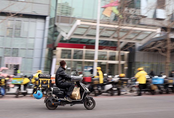 12月9日,北京西单商圈,外卖快递员送餐忙。南美侨报网特约记者卞程宣摄