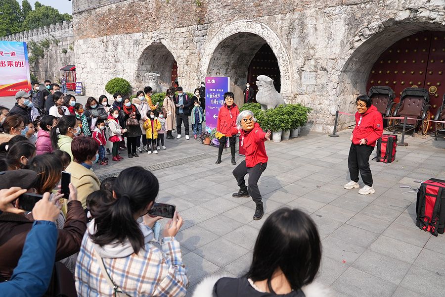 本次桂林艺术节,除了邀来优秀剧目在剧场演出,还在东西巷展开“城市戏剧巡游”,通过穿街走巷的巡游展示,让观众在户外环境中与艺术进行近距离的接触和互动。图为演员在桂林市东西巷巡游演出。新华社