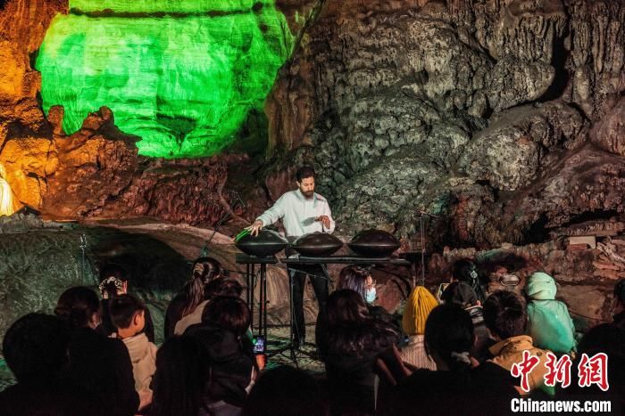 在桂林市七星岩溶洞内的手碟演奏。中新网
