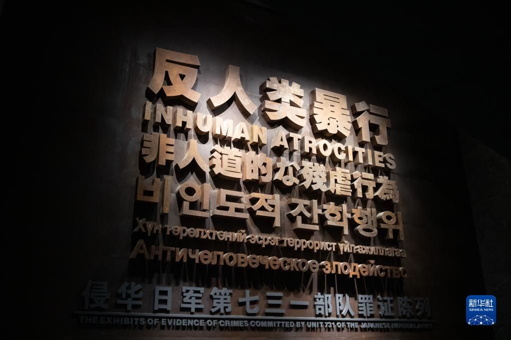 这是侵华日军第七三一部队罪证陈列馆内用六种语言写的“反人类暴行”墙(12月10日摄)。新华社